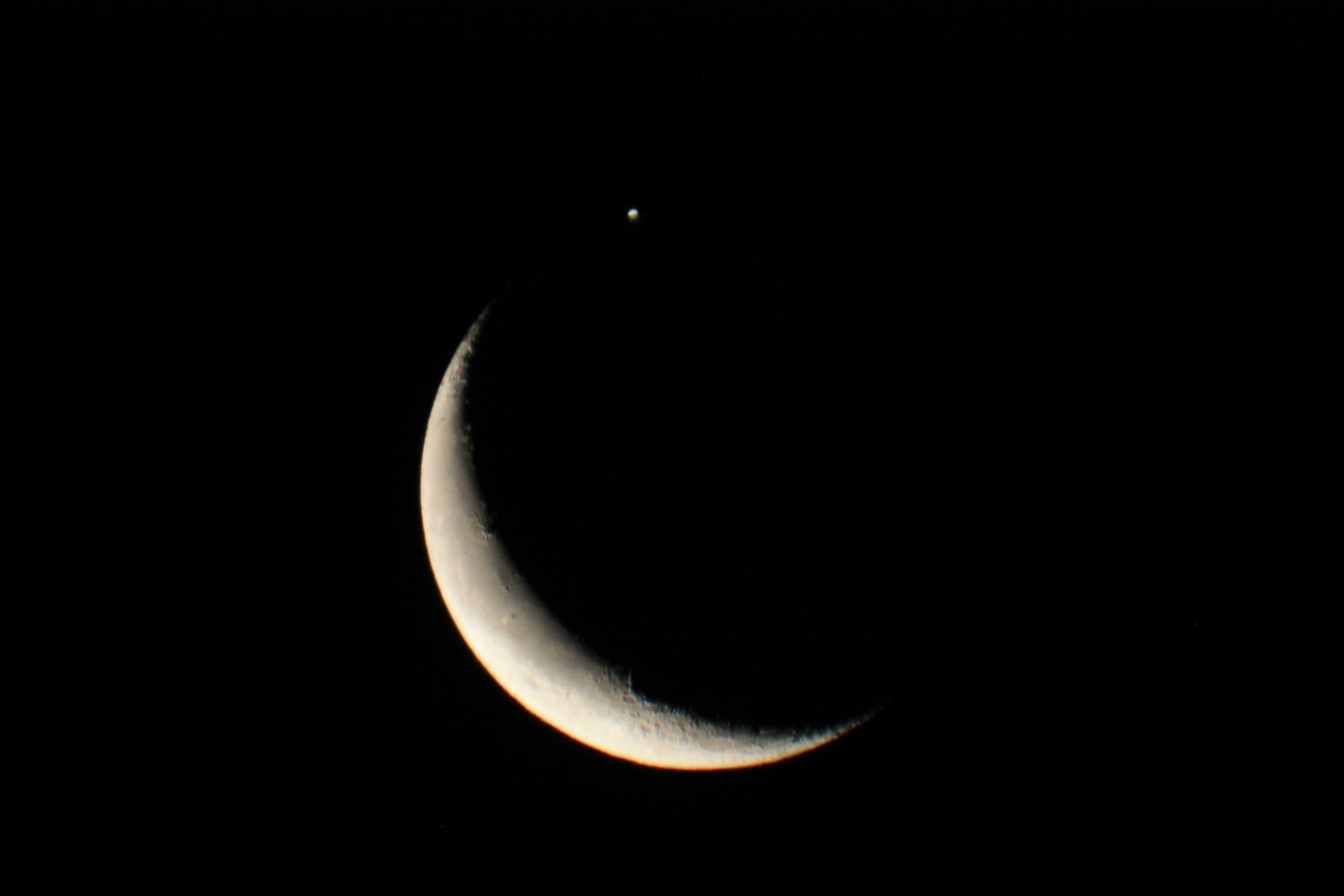 - Commentaire : Jupiter, après avoir été occultée par la Lune, est acompagnée par Vénus et Aldébaran, ainsi que l'amas des Pléiades en haut de la photo