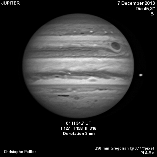- Paramètres de traitement de l'image : Alignement, addition sous Autostakkert 2, traitement ondelettes sous Registax 6 - Assemblage sous Winjupos