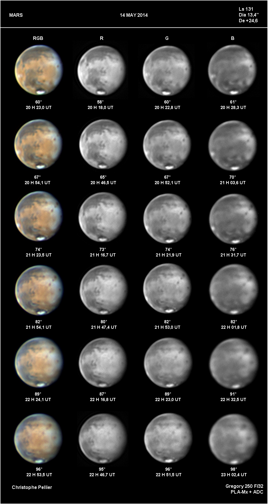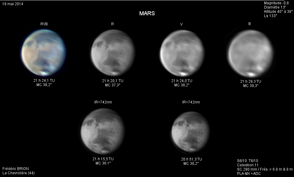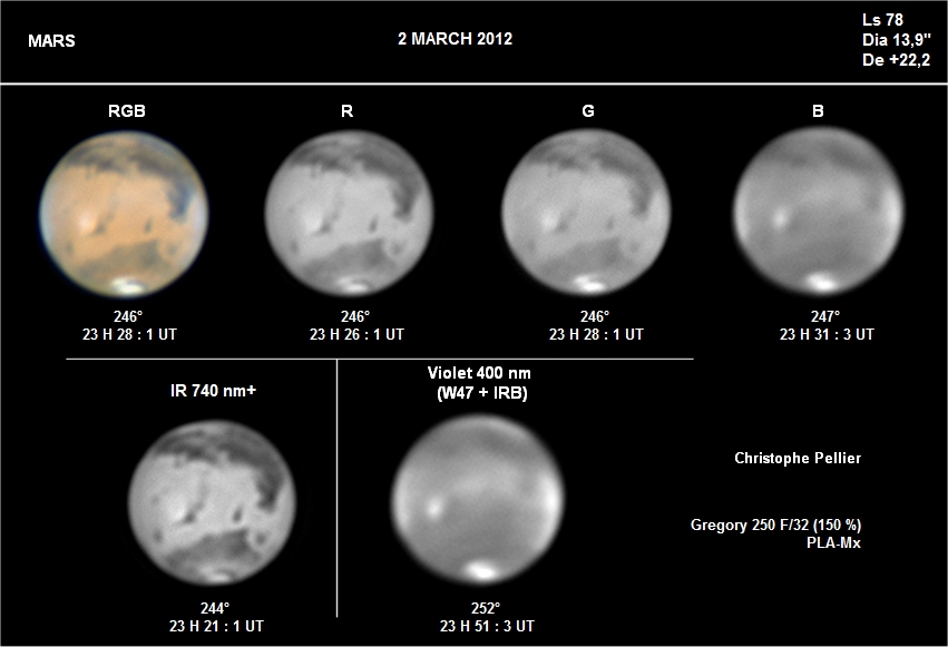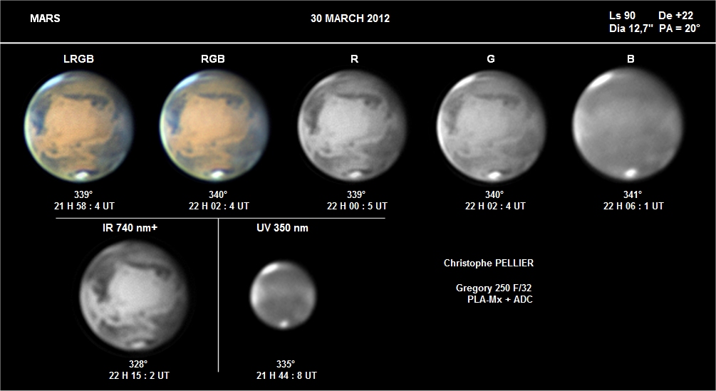 - Paramètres de prise de vue : Films AVI réalisés avec filtres RVB et IR 742 astronomik + W47 Meade + UV Astrodon