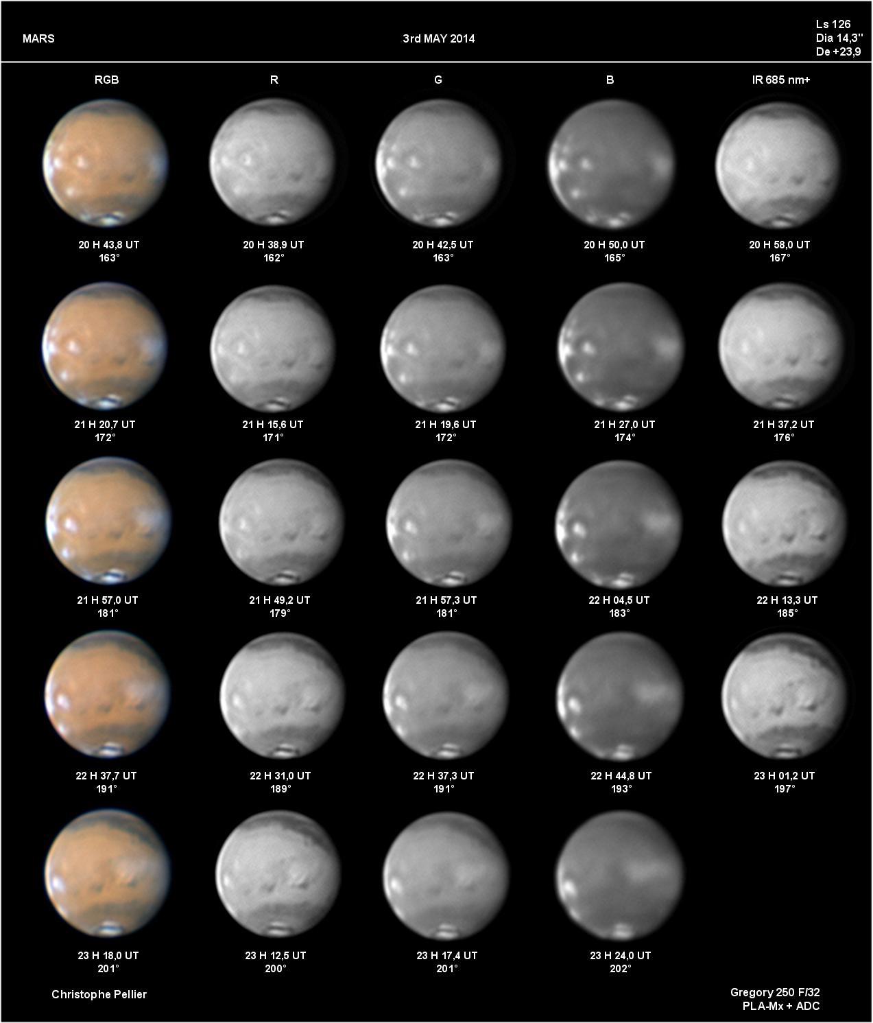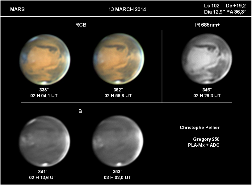 Paramètres de traitement de l'image : Alignement, addition, traitement ondelettes sous Registax 6 - Assemblage RVB sous Winjupos - Commentaire : Sur ces images, les nuages orographiques au-dessus des volcans de Tharsis commencent à se former. Ils apparaissent vers le milieu de la journée martienne et gonflent durant l'après-midi. Sur l'image RVB, il est midi sur Ascraeus, Arsia et Pavonis, mais il n'est que 10 H encore sur Olympus Mons.