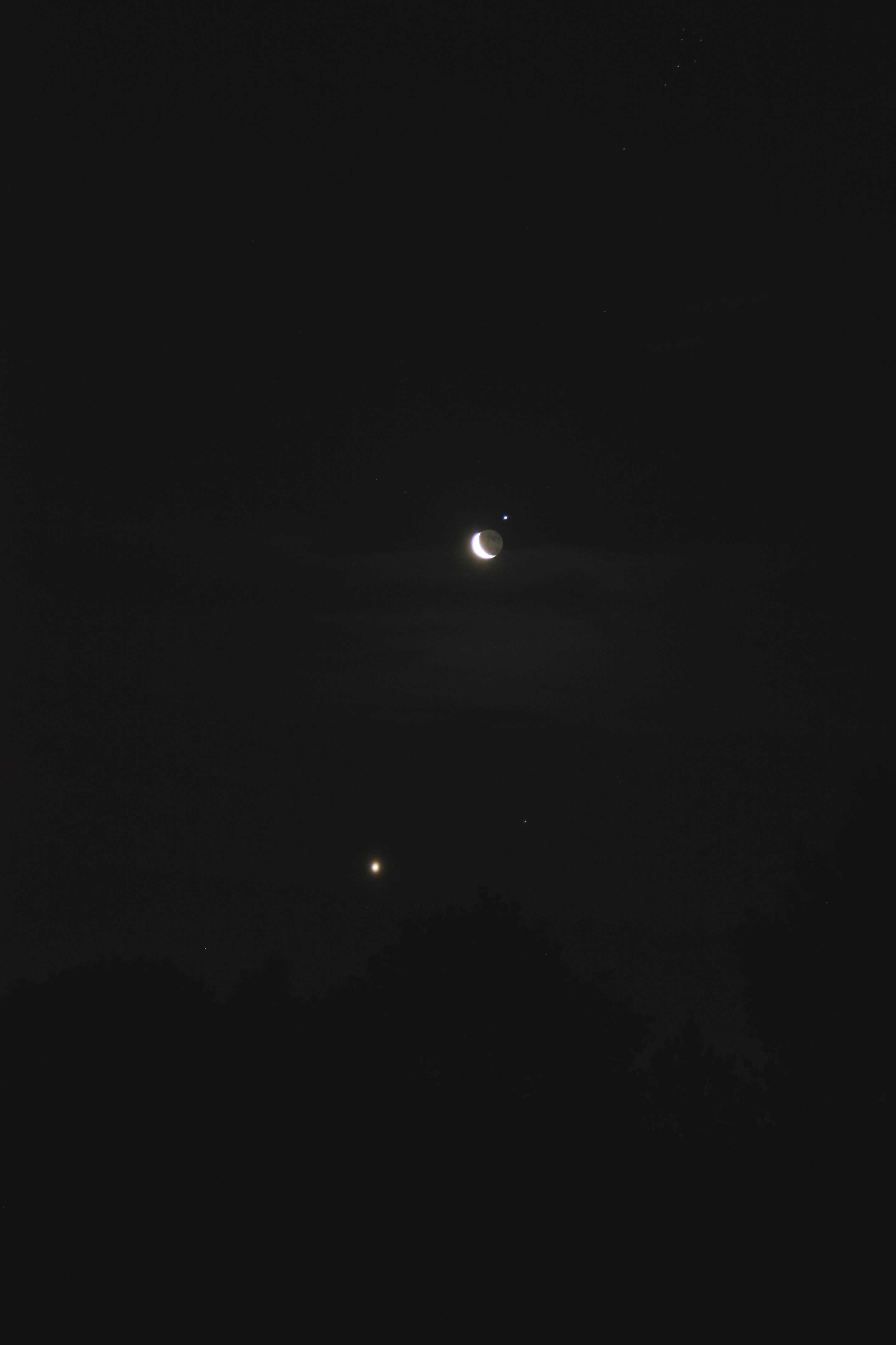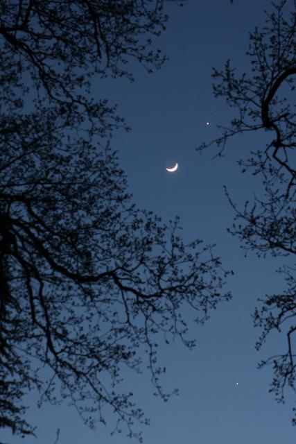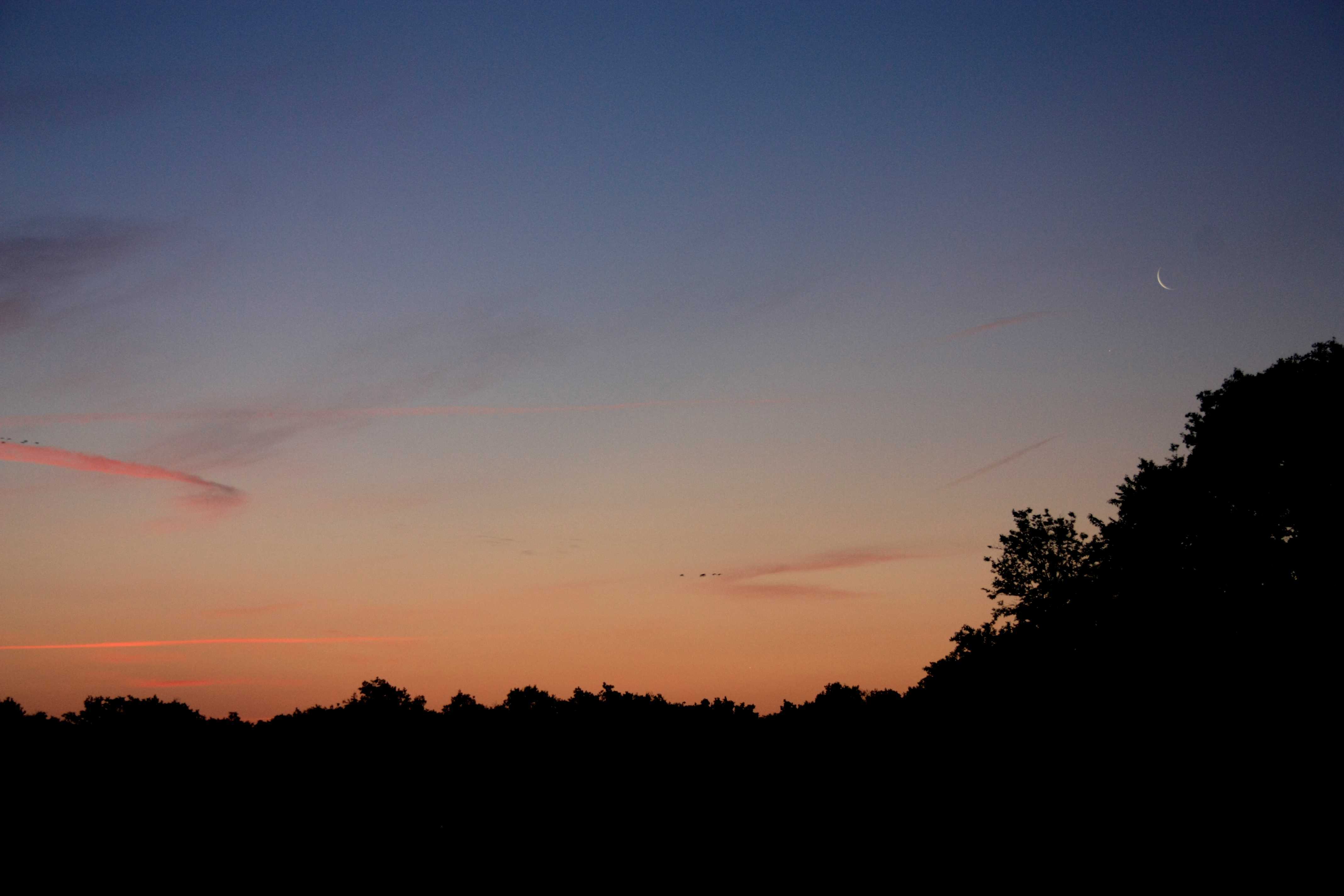 - Commentaire : La Lune est accompagnée de Jupiter juste en dessous à gauche, Vénus s'extirpe des arbres à l'horizon sous le passage des oiseaux