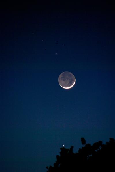 - Commentaire : Jupiter, après avoir été occultée par la Lune, est acompagnée par Vénus et Aldébaran, ainsi que l'amas des Pléiades en haut de la photo